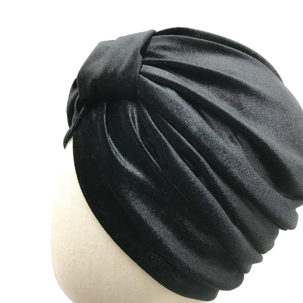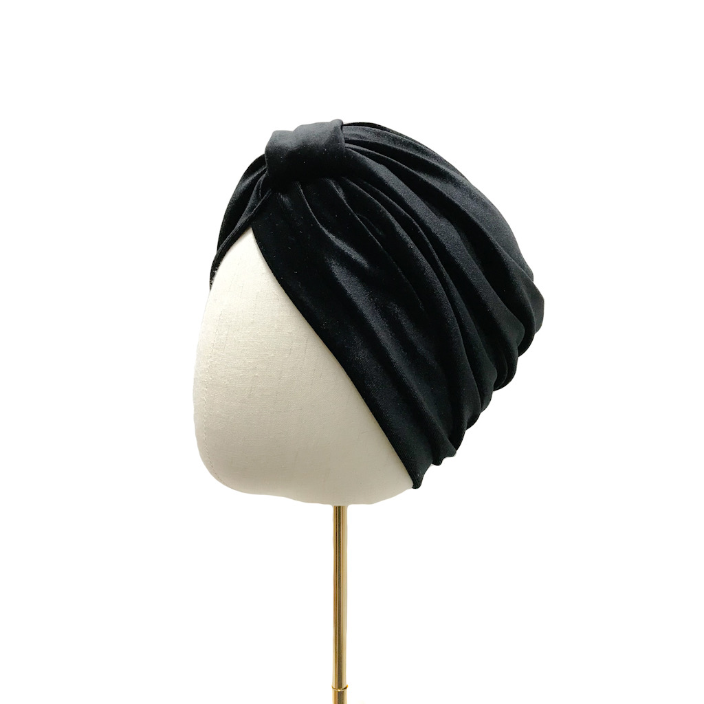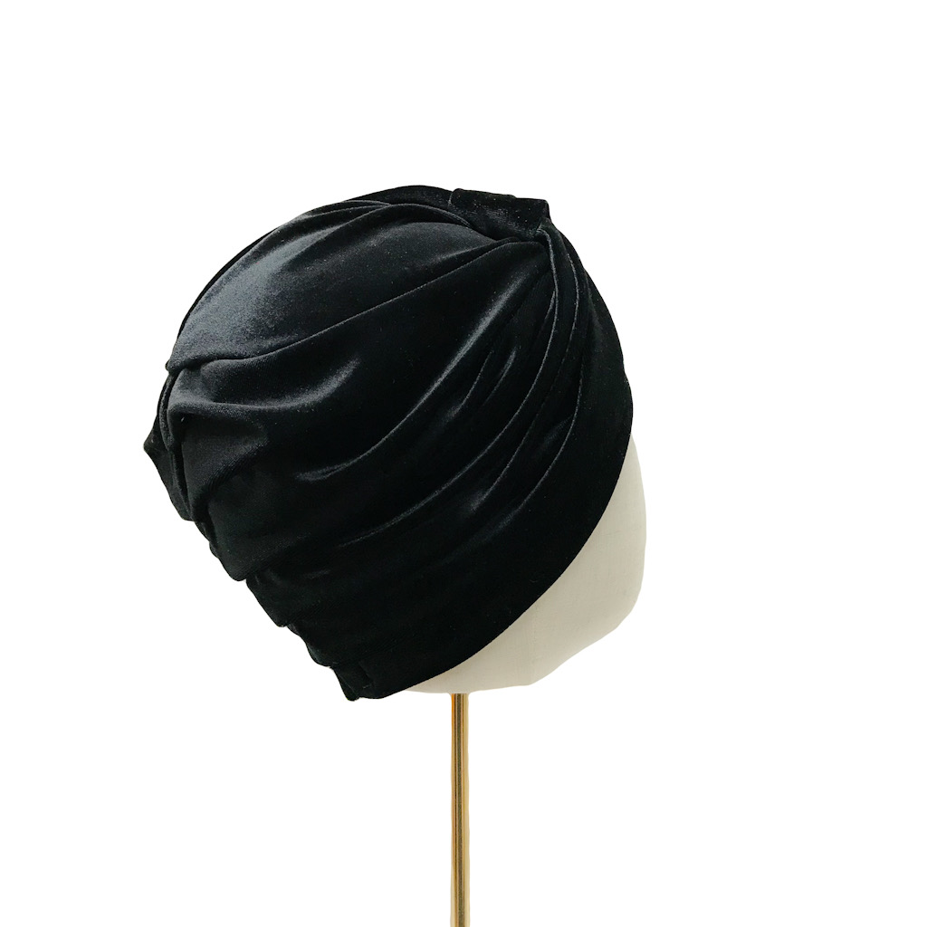 Tämä turbaani on valmistettu mustasta sametista (93% polyester, 7% elastaani) ja sen koko on S (55-57cm).