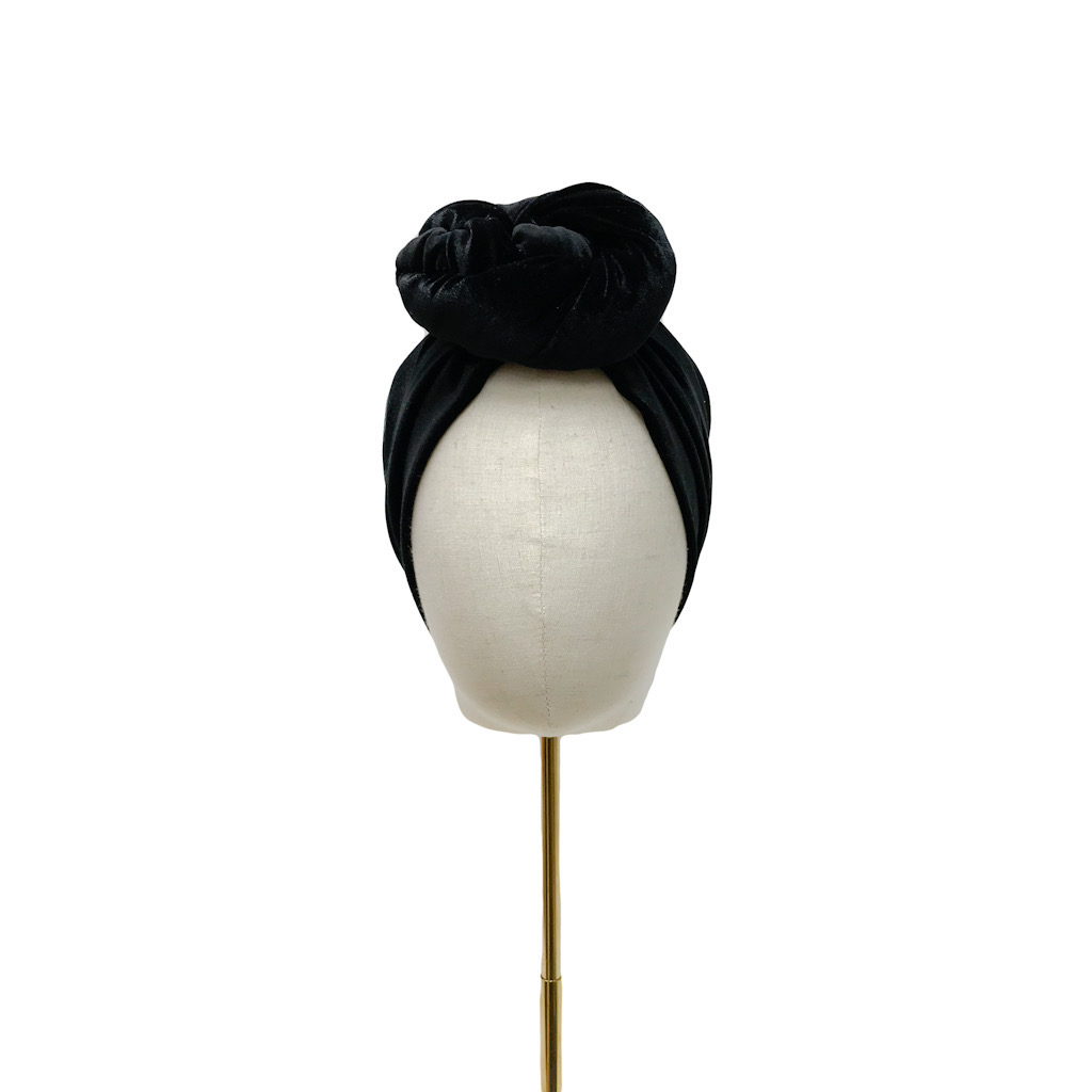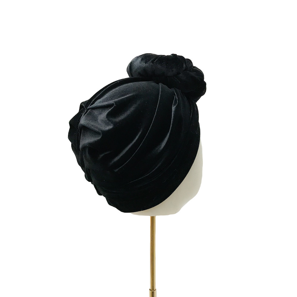 Tämä turbaani on valmistettu mustasta sametista (90% polyester, 10% elastaani) ja sen koko on S (55-57cm).