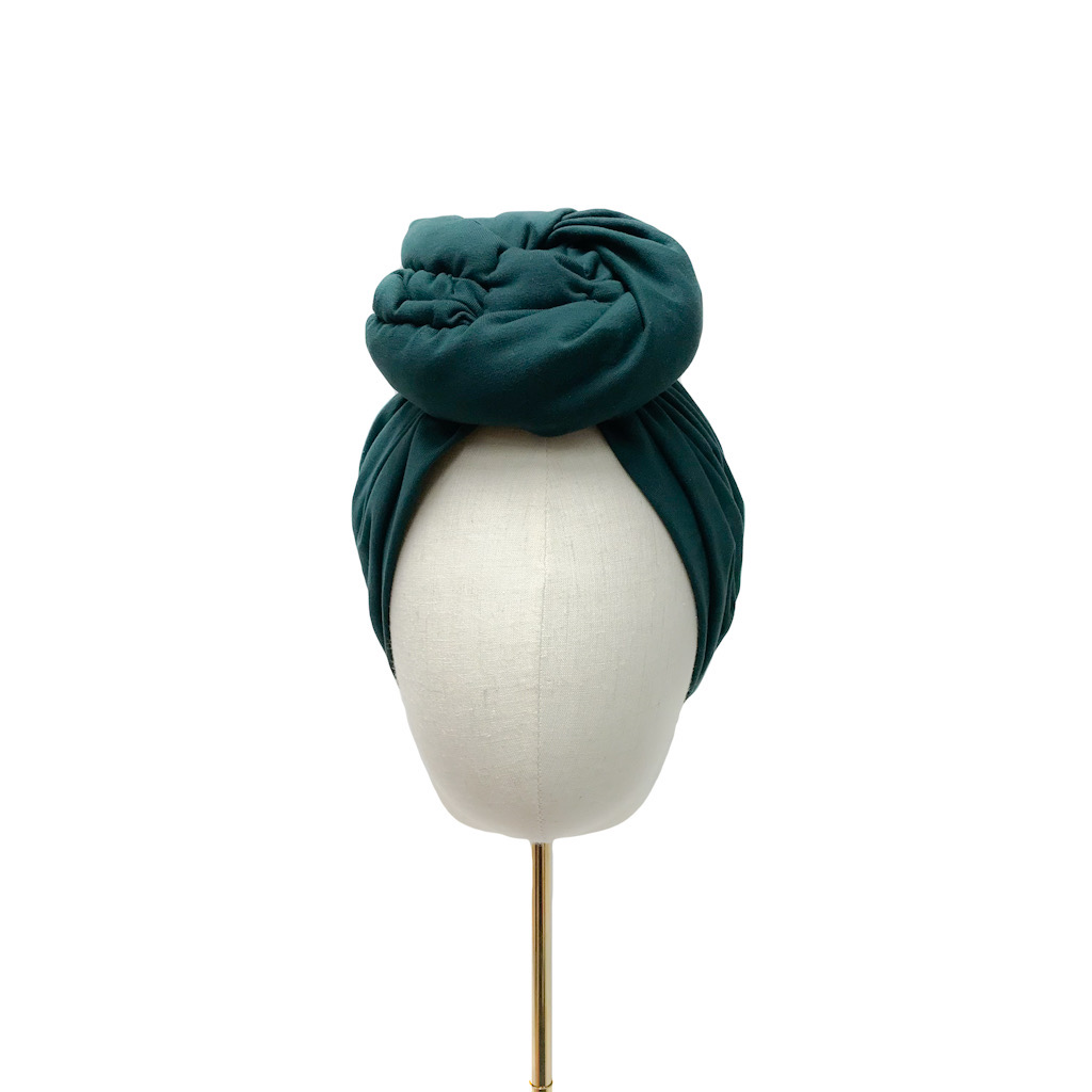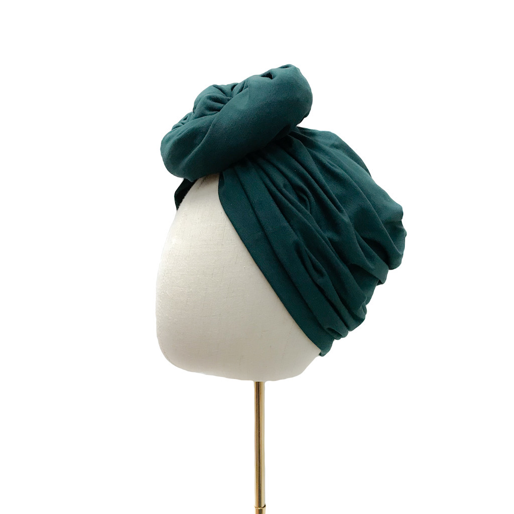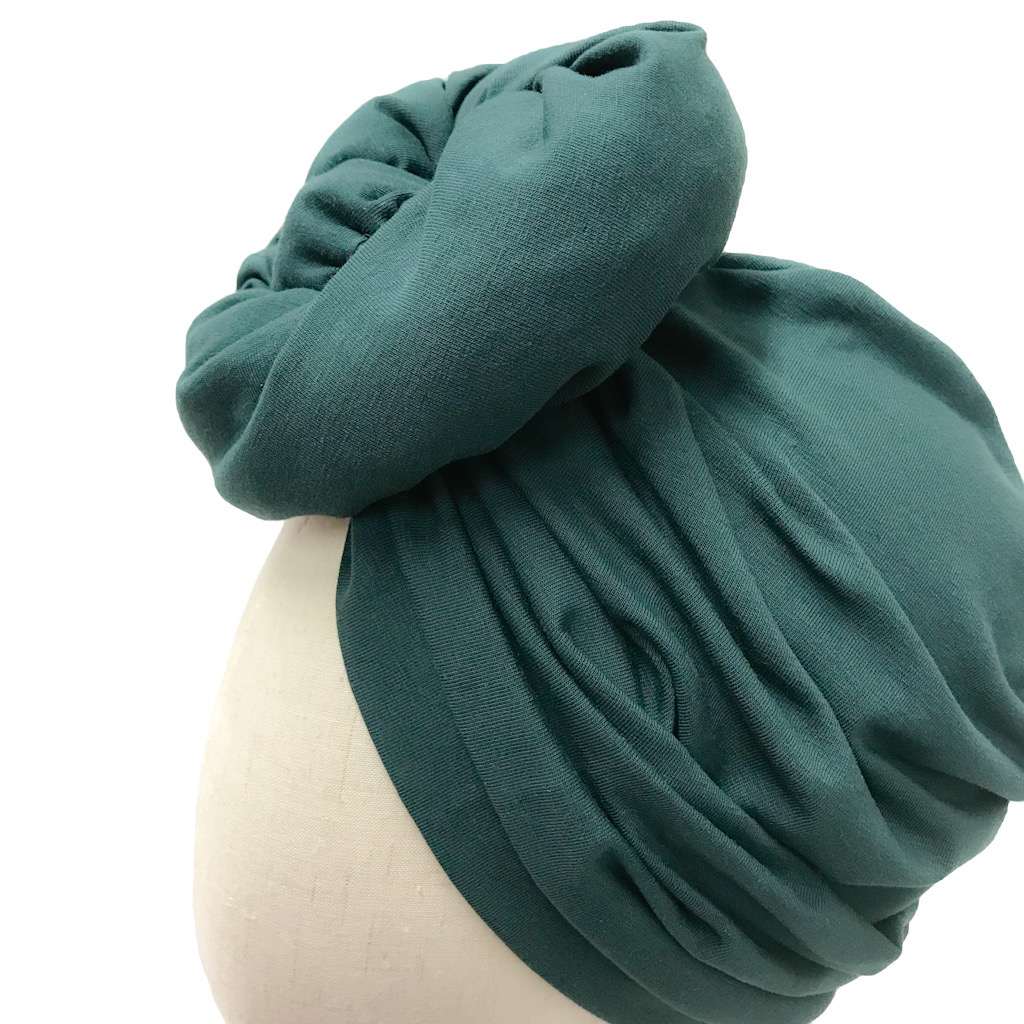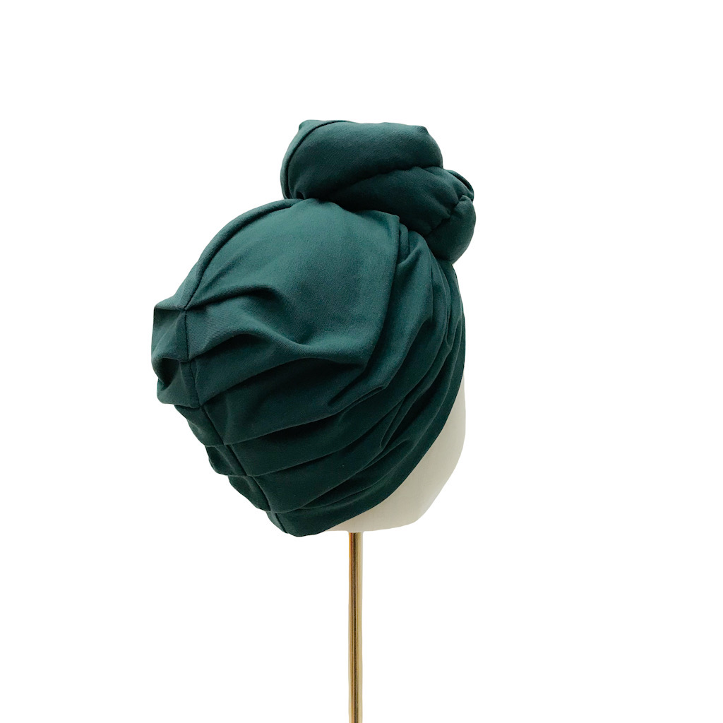 Tämä turbaani on valmistettu pullonvihreästä puuvillatrikoosta (95% puuvilla, 5% elastaani) ja sen koko on M (58-60cm).
